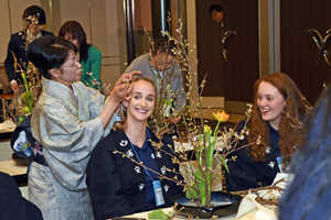 冒頭、浦安市2020年東京オリンピック・パラリンピック推進課課長の開会の挨拶より始まり、ご来日の歓迎の意を表して、浦安市より日本の伝統衣装である「法被」がプレゼントされました。お揃いの法被に袖を通し、和やかな雰囲気になったところで、華道協会会長より華道の歴史についての説明と講師による生け花を披露した後、実際に華道の体験をしていただきました。